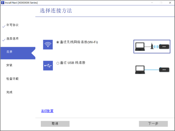 选择要使用的网络连接,通过无线网络连接 (Wi-Fi) 或通过有线 LAN 连接(以太网),然后单击下一步。
