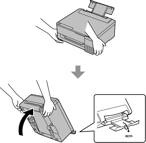 Con l'alimentatore carta posteriore estratto, afferrare entrambi i lati della parte anteriore della stampante e inclinare la stampante di circa 45 gradi verso il retro.