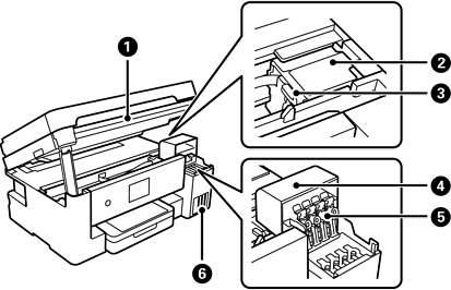 Scans placed originals. Open to refill the ink tank or to remove jammed paper. This unit should usually be kept closed. |