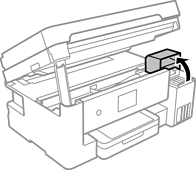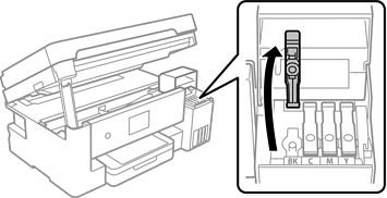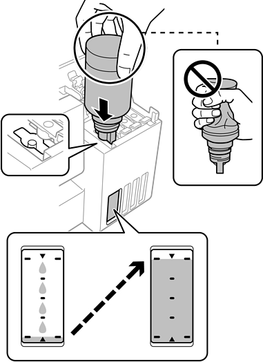 如果墨水未流入墨仓中,请取下墨瓶,然后重新插入。但是,如果墨水已到达上线,请勿重新插入墨瓶;否则墨水可能会泄漏。