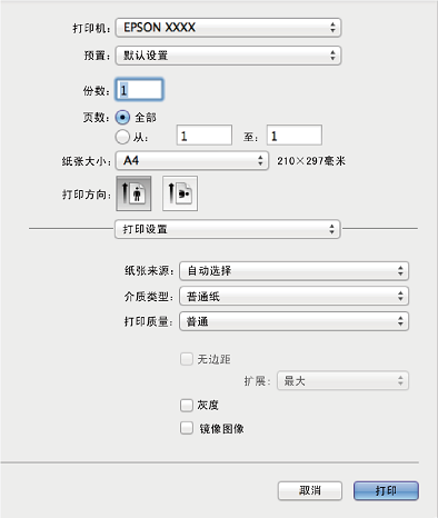 如果 macOS Catalina (10.15) 或更高版本、macOS High Sierra (10.13)、macOS Sierra (10.12)、OS X El Capitan (10.11)、OS X Yosemite (10.10)、OS X Mavericks (10.9)、OS X Mountain Lion (10.8) 中未显示打印设置菜单,则表明未正确安装爱普生打印机驱动程序。从以下菜单启用爱普生打印机驱动程序。