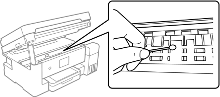 如果清洁导纸轨后也无法解决问题,则表明图中所示的打印机内部部位被涂污。这时请关闭打印机,然后使用棉签擦拭掉墨水。