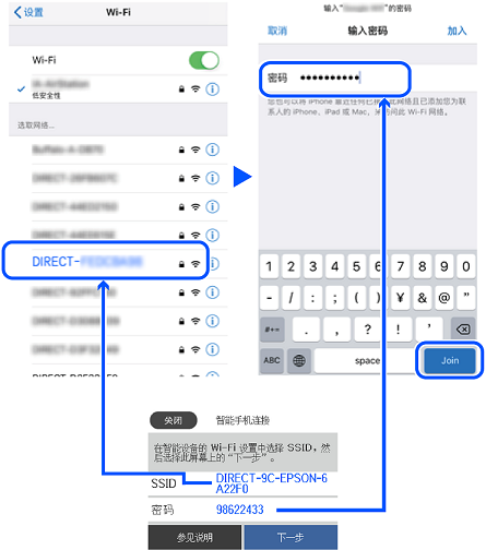 在智能设备的 Wi-Fi 屏幕上,选择本产品操作面板上显示的 SSID,然后输入密码。