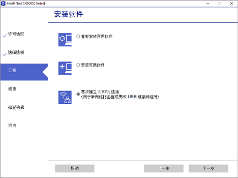 在安装软件屏幕上选择再次建立打印机连接(用于新网络路由器或更改 USB 连接网络等),然后单击下一步。