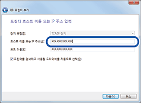 호스트 이름 또는 IP 주소 또는 프린터 이름 또는 IP 주소에 프린터의 IP 주소 또는 프린터 이름을 입력한 후 다음을 클릭합니다.
