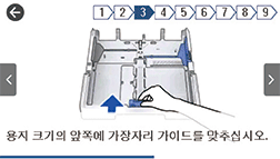 LCD 화면에서 용지 급지 또는 걸린 용지 제거와 같은 조작 방법의 애니메이션을 볼 수 있습니다.