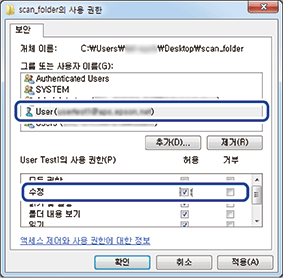 사용 권한 화면에서 그룹 또는 사용자 이름에 입력한 사용자 이름을 선택하고 수정에서 허용을 선택한 후 확인을 클릭합니다.