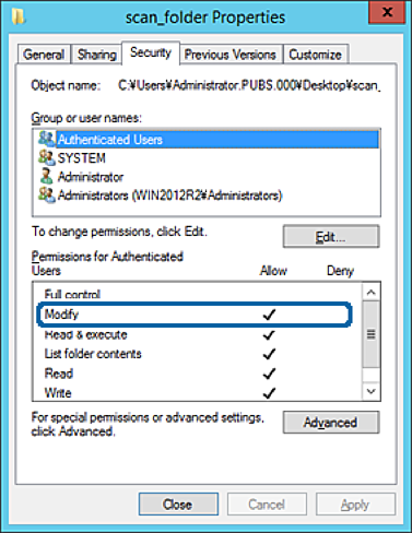 If it is not selected, select Authenticated Users, click Edit, select Allow on Modify in Permissions for Authenticated Users, and then click OK.