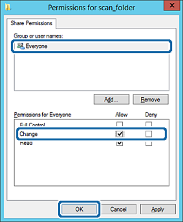 Select Everyone group of Group or user names, select Allow on Change, and then click OK.