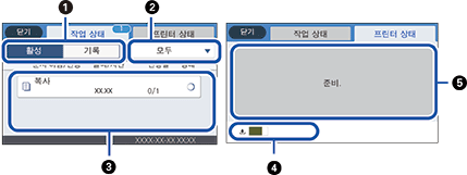 버튼을 눌러 상태 메뉴를 표시합니다. 프린터 또는 작업 상태를 확인할 수 있습니다.