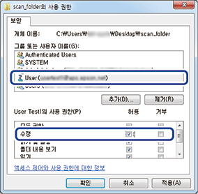 사용 권한 화면에서 그룹 또는 사용자 이름에 입력한 사용자 이름을 선택하고 수정에서 허용을 선택한 후 확인을 클릭합니다.