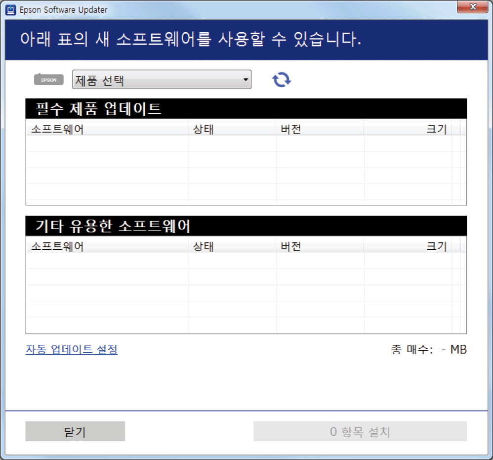 Windows Server 운영 체제를 사용할 경우 Epson Software Updater를 사용할 수 없습니다. Epson 웹 사이트에서 최신 응용 프로그램을 다운로드 할 수 있습니다.