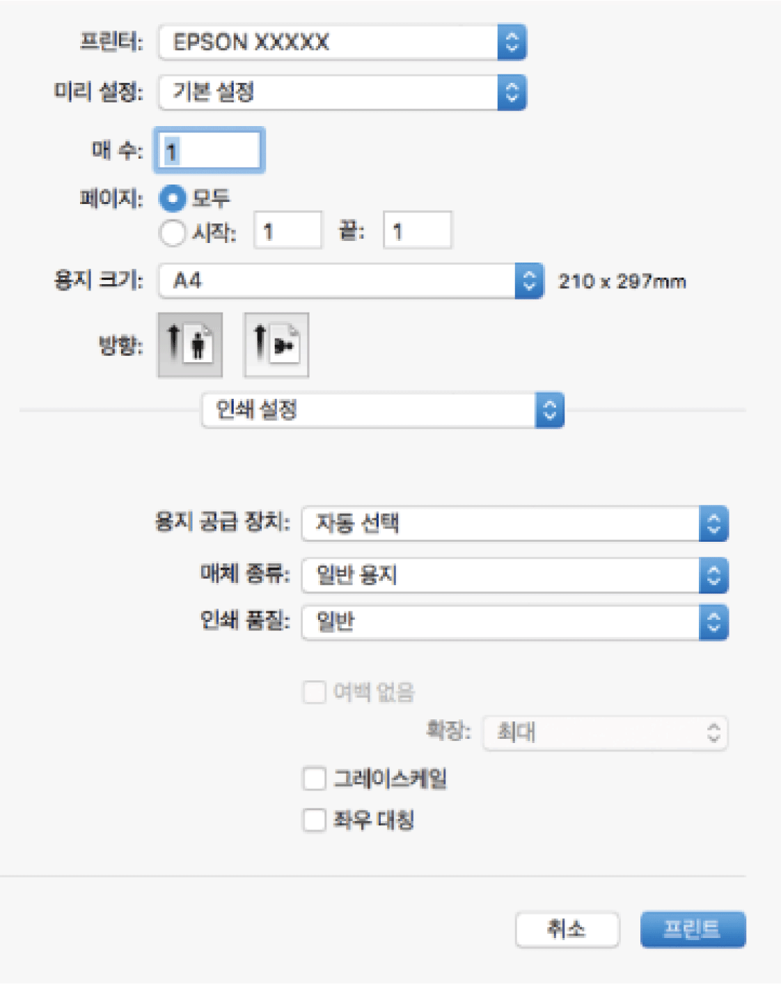 인쇄 설정 메뉴가 macOS Catalina (10.15) 또는 이후 버전, macOS 높게 Sierra (10.13), macOS Sierra (10.12), OS X El Capitan (10.11), OS X Yosemite (10.10), OS X Mavericks (10.9), OS X Mountain Lion (10.8)에 표시되지 않는 경우, Epson 프린터 드라이버가 올바르게 설치된 상태가 아닙니다. 다음 메뉴에서 활성화하십시오.