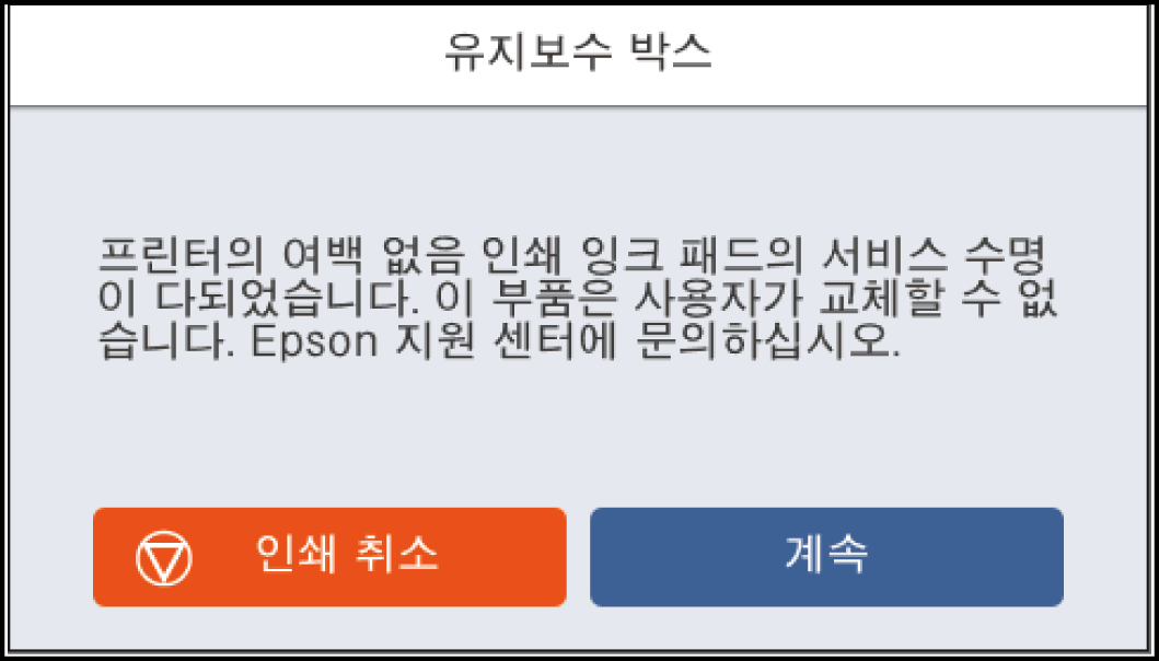 유지보수 상자 교체를 알리는 메시지가 표시되면 제어판에 표시되는 애니메이션을 참조하십시오. 유지보수 상자를 교체해야 한다고 해서 프린터가 제품 사양에 따라 작동이 중단된 것은 아닙니다. 교체 비용은 Epson의 무상 보증 서비스가 적용되지 않습니다. 사용자가 직접 교체할 수 있습니다.