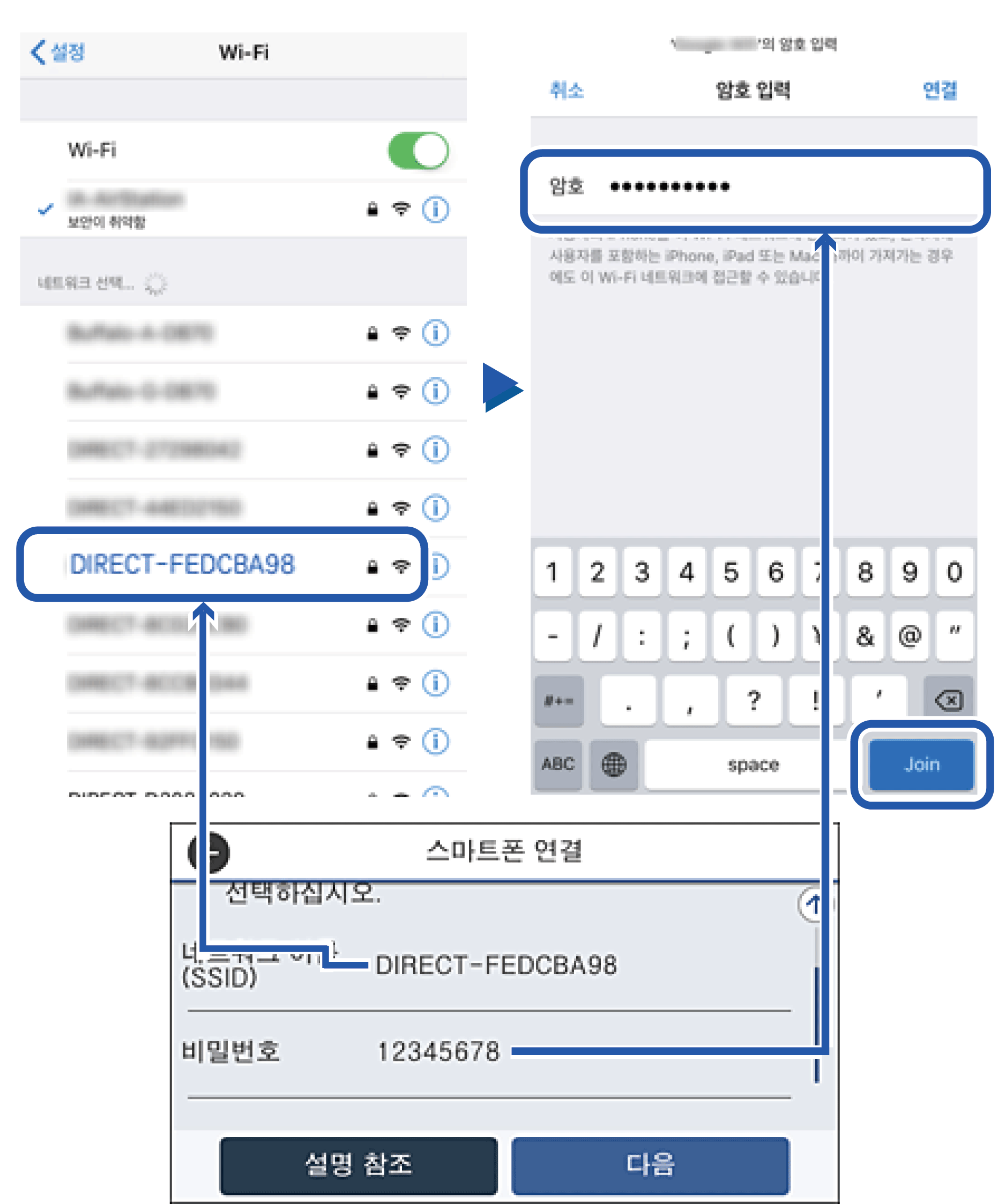 스마트 기기의 Wi-Fi 화면에서 프린터 제어판에 표시된 SSID를 선택하고 비밀번호를 입력합니다.