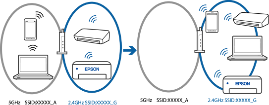 Većina bežičnih usmjernika ima funkciju odvajača koja blokira komunikaciju među uređajima koji imaju isti SSID. Ako ne možete komunicirati između pisača i računala ili pametnog uređaja čak i kada su spojeni na istu mrežu, onemogućite funkciju odvajača na bežičnom usmjerniku. Provjerite priručnik isporučen uz bežične usmjernike kako biste saznali više informacija.