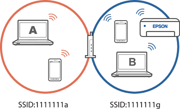 Ako se SSID-ovi koje dodjeljuje bežični usmjernik ne obrađuju kao ista mreža, tada to djeluje kao da je svako računalo povezano na različitu mrežu. Kada počnete postavljati pisač s računala A, pisač se dodaje u istu mrežu u kojoj je i računalo A što tom računalu omogućuje ispis na tom pisaču.