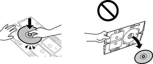Apăsaţi pe centrul discului pentru a-l aşeza în siguranţă pe tava pentru disc/carte de identitate. Întoarceţi tava, pentru a vă asigura că discul nu cade şi este fixat ferm pe tava pentru disc/carte de identitate.