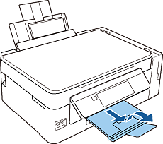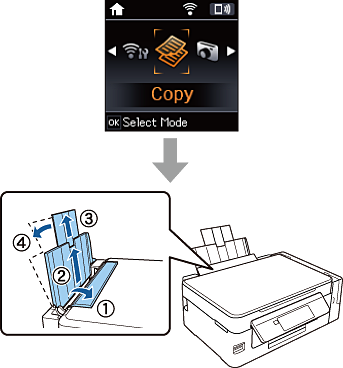 1 Уверете се, че началният екран е изведен на екрана на принтера. Отворете предпазителя на подаващото устройство, удължете поставката за хартия и след това я наклонете назад.