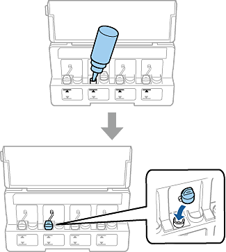 3 Отстранете капачката на бутилката с мастило, извадете уплътнението от бутилката и след това поставете капачката.