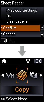 On the printer's screen, check that A4 is selected as a paper size and plain papers is selected as a paper type. Then press