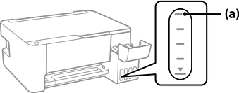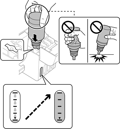 Kui tint ei hakka mahutisse voolama, eemaldage tindipudel ja sisestage see uuesti. Ärge aga eemaldage tindipudelit ja paigaldage seda tagasi, kui tint on jõudnud ülemise jooneni, vastasel korral võib tinti lekkida.