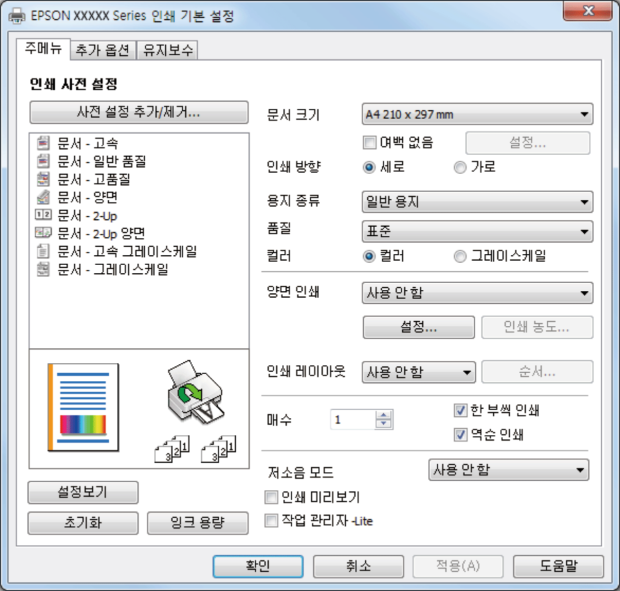 프린터 드라이버 창을 열려면 기본 설정 또는 속성을 선택합니다.