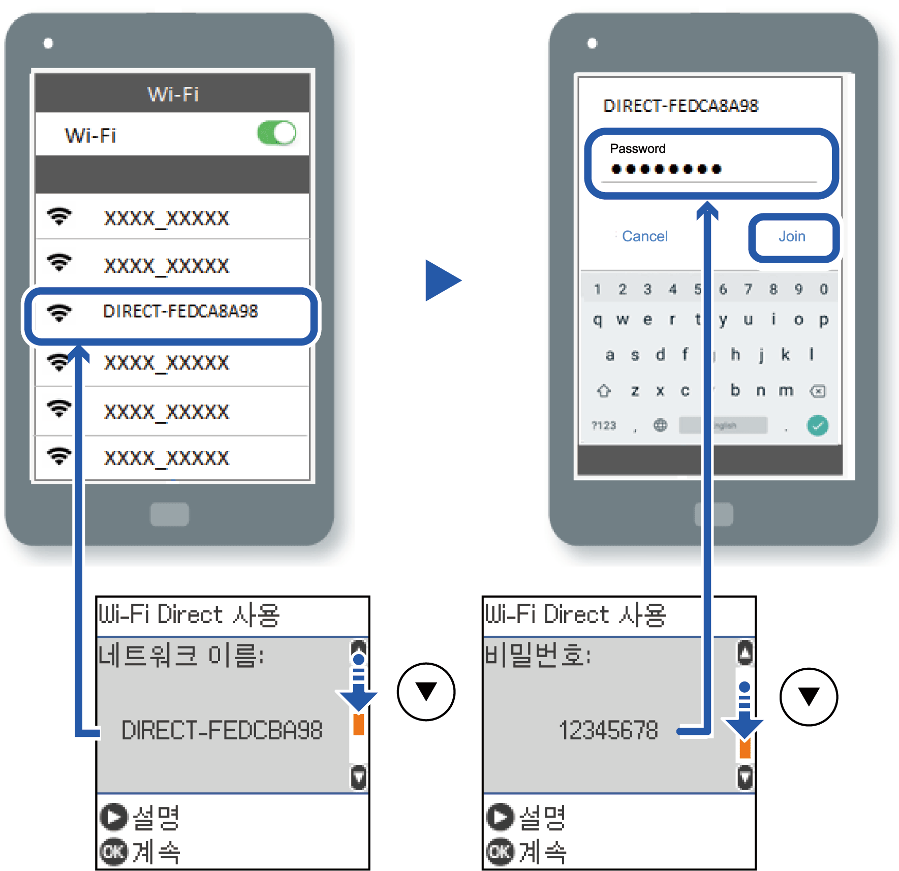 스마트 기기의 Wi-Fi 화면에서 프린터 제어판에 표시된 SSID를 선택하고 비밀번호를 입력합니다.