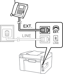 Als u een enkele telefoonlijn deelt, zorg er dan voor dat u uw telefoontoestel aansluit op de EXT.-poort van de printer. Als u de lijn splitst om de telefoon en de printer afzonderlijk aan te sluiten, werken de telefoon en de printer niet goed.