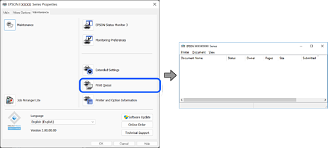 Щракнете върху Опашка за печат в раздела Поддръжка на драйвера на принтера.