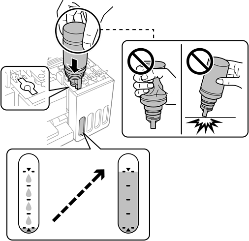 Mürekkep şişesinin en üstünü doldurma portuyla hizalayın ve sonra üst çizgide otomatik durana kadar mürekkep doldurmak için doğrudan porta takın.