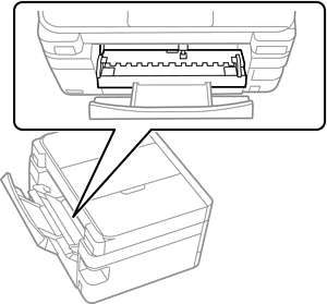 Après avoir lentement remis l'imprimante en position horizontale, vérifiez la zone suivante. Si vous trouvez des objets étrangers, enlevez-les à l'aide d'une pince à épiler ou d'un outil similaire. Vérifiez ensuite à travers l'espace du chargeur de papier arrière pour vous assurer que tous les objets étrangers ont été enlevés.