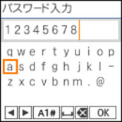 ネットワーク設定時やファクスの宛先登録時の数字や文字、記号の入力は、 ボタンと画面に表示されるキーボードを使います。 ボタンで入力したい文字やファンクションキーを選択して、OKボタンを押します。入力が全て終わったらOKを選択して、OKボタンで決定します。