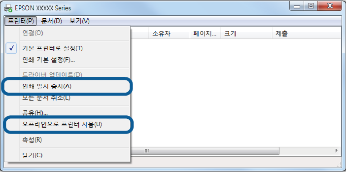 프린터가 오프라인 또는 보류 상태인 경우, 프린터 메뉴에서 오프라인 또는 보류 설정을 해제하십시오.