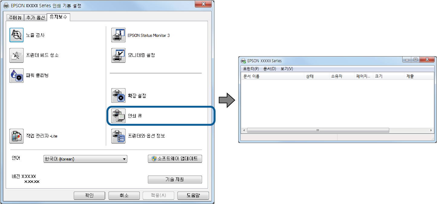 프린터 드라이버의 유지보수 탭에서 인쇄 큐를 클릭합니다.