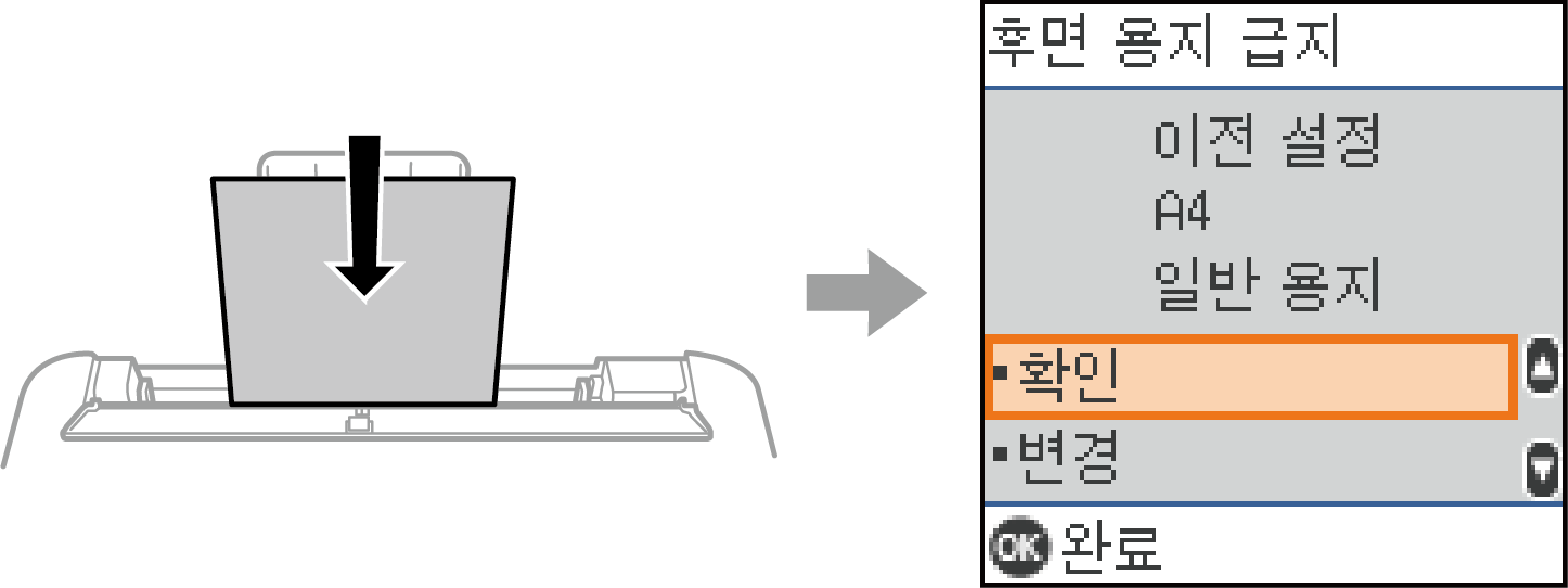 표시된 용지 크기 및 유형이 급지된 용지와 다른 경우, 용지 크기 및 용지 유형에 대한 설정을 변경한 다음 확인합니다.