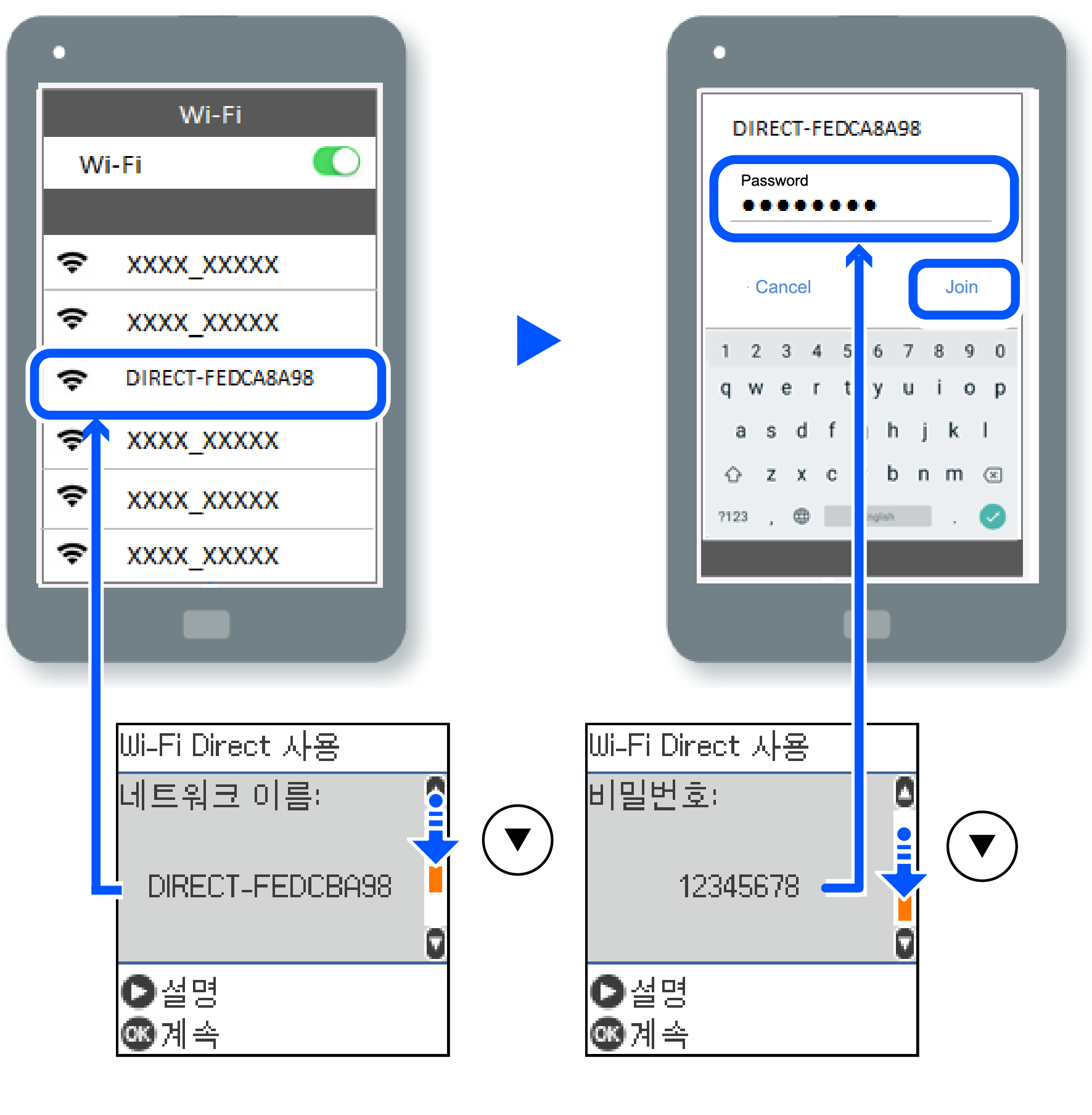 스마트 기기의 Wi-Fi 화면에서 프린터 제어판에 표시된 SSID를 선택하고 비밀번호를 입력합니다.