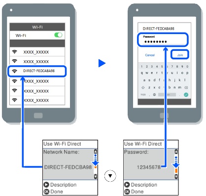 Ühendamiseks valige mobiilseadme Wi-Fi-ekraanilt SSID, mis on kuvatud printeri juhtpaneelil ning sisestage parool.