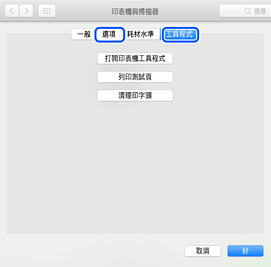 從 Apple 功能表選取[系統偏好設定] (或[系統設定]) > [印表機和掃描器] (或[列印和掃描]、[列印與傳真]),然後選取印表機。點選[選購品和耗材],如果視窗內顯示[選購品]索引標籤和[公用程式]索引標籤,表明您的電腦已安裝原廠 Epson 印表機驅動程式。
