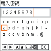 使用 、、 和 鍵,以及 LCD 螢幕上的軟體鍵盤,可從控制台輸入網路設定的字元和符號。按下 、、 或 鍵以選取鍵盤上的某個字元或功能鍵,然後按下 OK 鍵。完成字元的輸入後,選取 [OK],然後按下 OK 鍵。