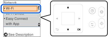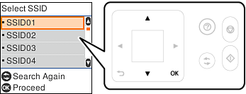 5 Valitse SSID yhteyden muodostamiseksi langattomaan reitittimeen tulostimen ohjauspaneelista ja paina sitten OK-painiketta.