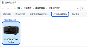 选择控制面板 > 硬件和声音中的查看设备和打印机(打印机、打印机和传真),单击打印机图标,然后单击窗口上方的打印服务器属性。