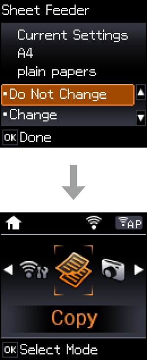 4  On the printer's screen, check that A4 is selected as a paper size and plain papers is selected as a paper type. Then press the OK button.