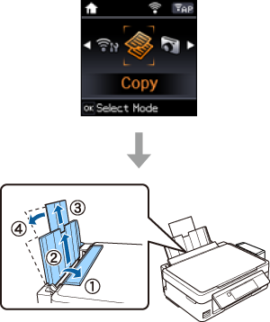 1  Make sure the home screen is displayed on the printer's screen. Open the feeder guard, extend the paper support, and then tilt it backward.