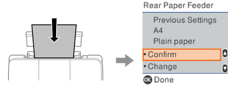 Beim Festlegen der Papiergröße und des Papiertyps informiert Sie der Drucker auf dem beim Einlegen von Papier angezeigten Bildschirm, falls die registrierten Angaben von den Druckeinstellungen abweichen. So wird verhindert, dass Sie Papier und Tinte verschwenden, indem sichergestellt wird, dass Sie nicht auf Papier mit dem falschen Format drucken oder unerwartete Farben sehen, wenn Einstellungen verwendet werden, die nicht mit der Papiersorte übereinstimmen.