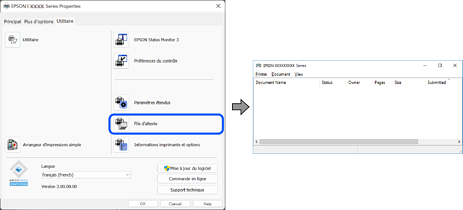 Cliquez sur File d'attente au niveau de l’onglet Utilitaire du pilote d’impression.