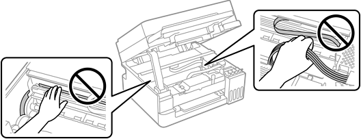 異物を取り除く際に、図で示した箇所に触れないでください。プリンターが故障するおそれがあります。