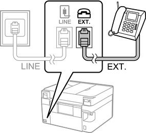 1つの電話回線で、ファクスと電話の両方を使用するときは、必ず外付け電話機をプリンターのEXT.ポートに接続してください。同回線にプリンターと並列で接続すると(ブランチ接続)、プリンターも電話機も正常な動作ができなくなります。