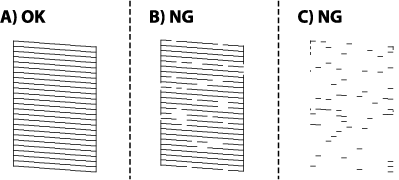如果在交替运行 3 次喷嘴检查和清洗或一次深度清洗后,所有喷嘴检查线条未完整打印出来,请等待至少 12 小时,等待期间不要进行打印(建议关闭打印机电源),然后运行喷嘴检查。如果所有喷嘴检查线条未完整打印出来,请再次运行清洗和喷嘴检查。如果所有喷嘴检查线条仍未完整打印出来,请运行大墨量冲洗。
