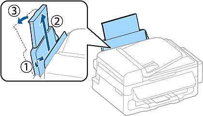 1 ホーム画面が表示されていることを確認します。給紙口カバーを開け、用紙サポートを真上に引き出してから後ろに倒します。